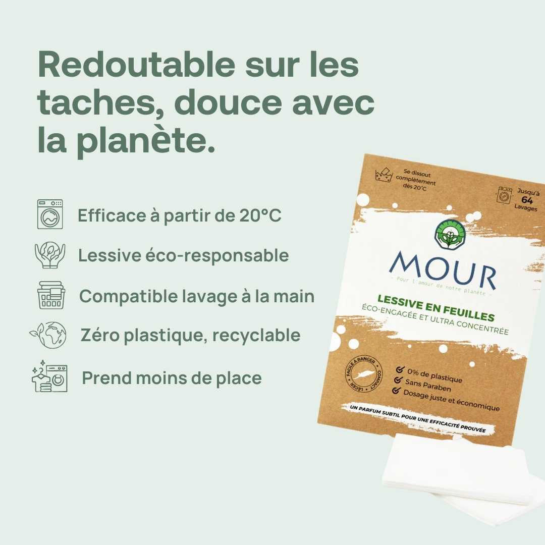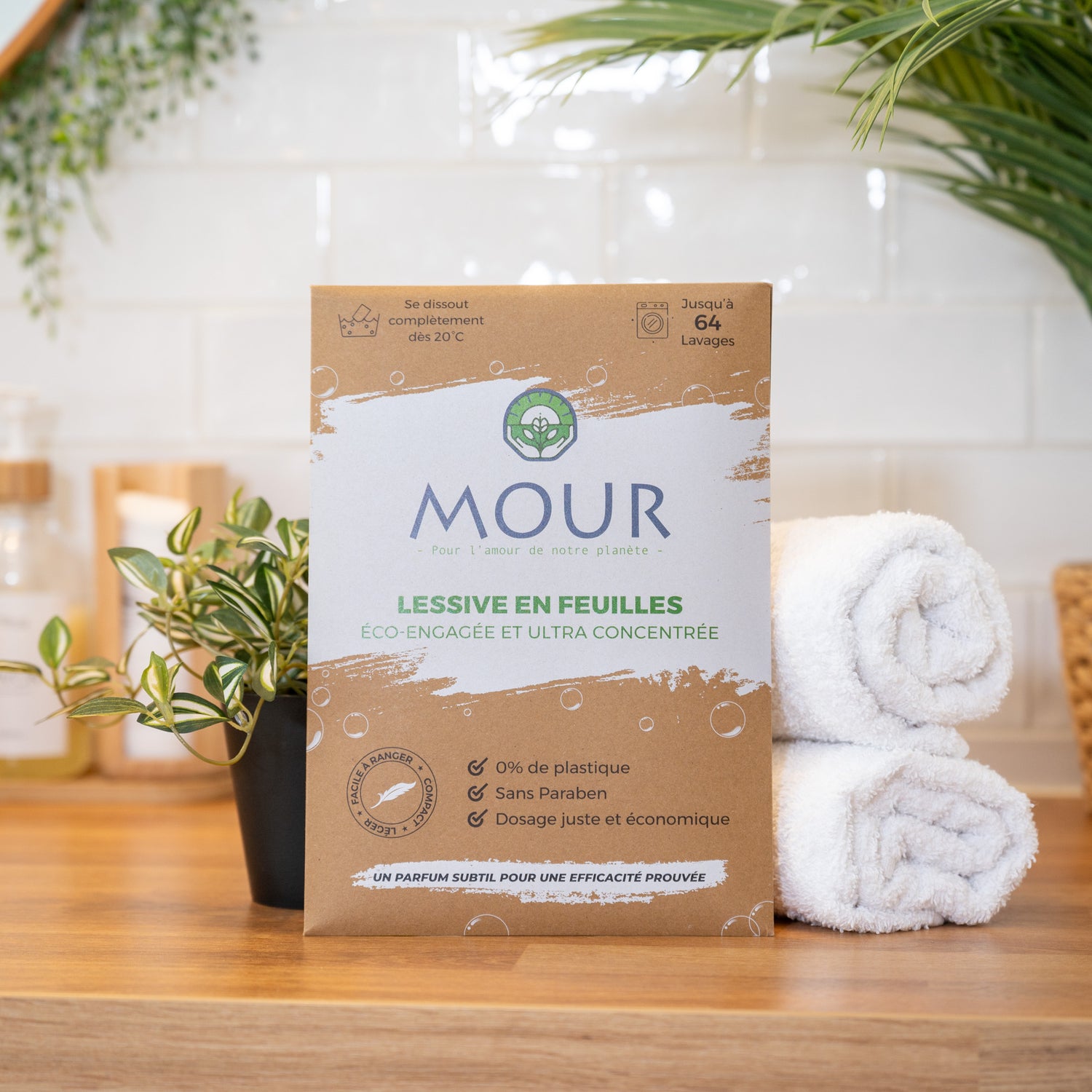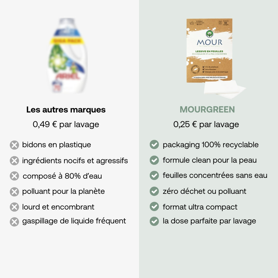 Les lessives classiques posent un vrai problème écologique. Leurs bidons en plastique, difficiles à recycler, finissent trop souvent dans la nature. En plus des formules remplies d’ingrédients controversés qui polluent l’eau et agressent la peau. Mourgreen fait le choix inverse : une lessive en feuille, sans plastique, sans composants nocifs, dans un emballage 100 % recyclable.