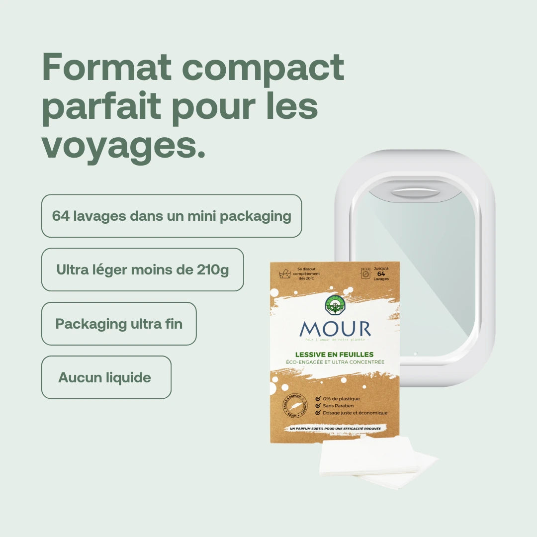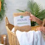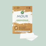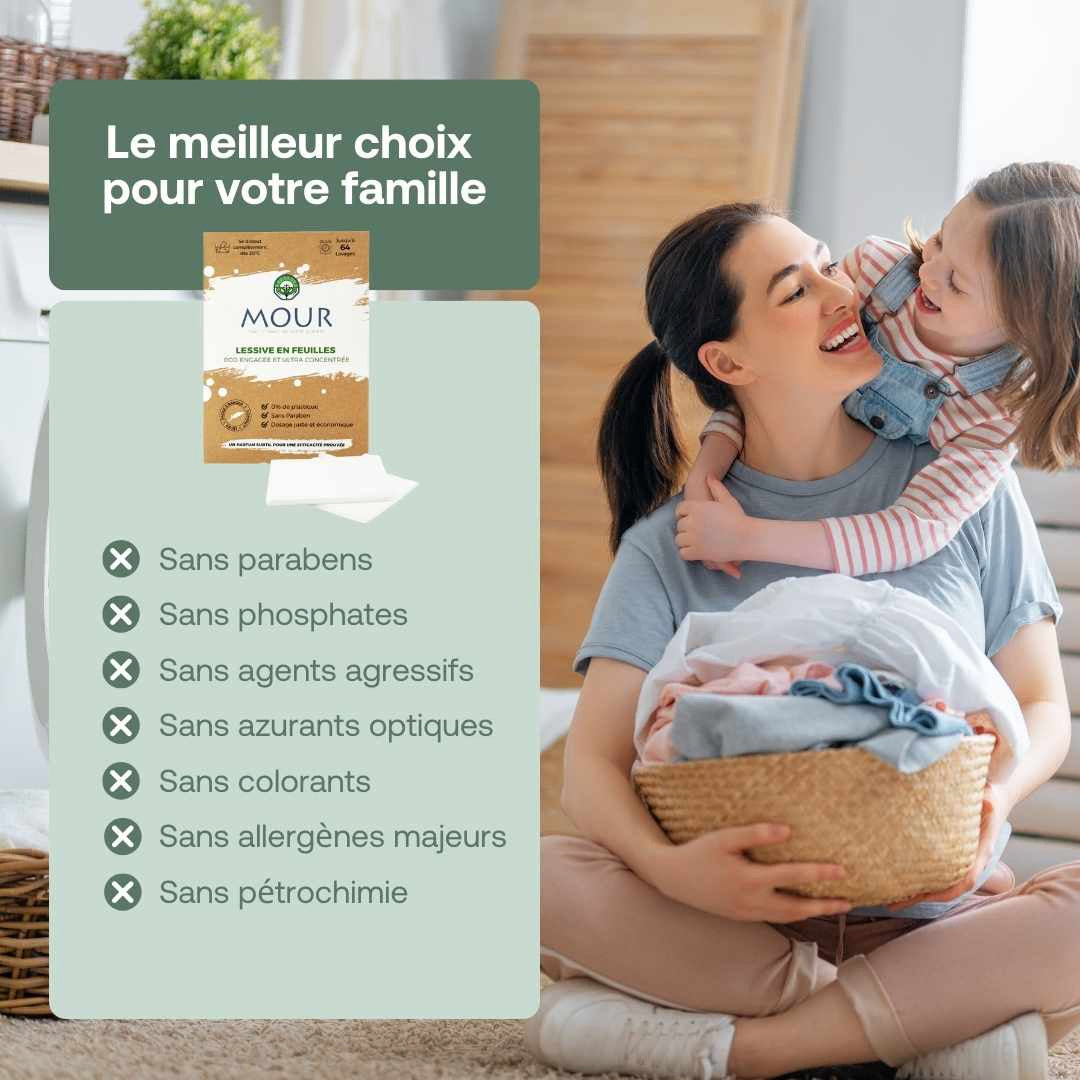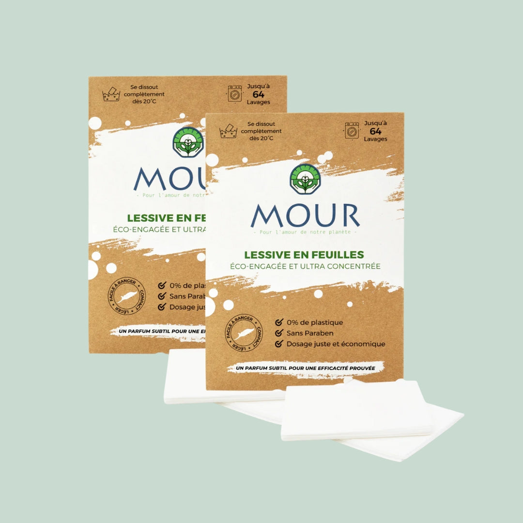 Les lessives classiques posent un vrai problème écologique. Leurs bidons en plastique, difficiles à recycler, finissent trop souvent dans la nature. En plus des formules remplies d’ingrédients controversés qui polluent l’eau et agressent la peau. Mourgreen fait le choix inverse : une lessive en feuille, sans plastique, sans composants nocifs, dans un emballage 100 % recyclable.